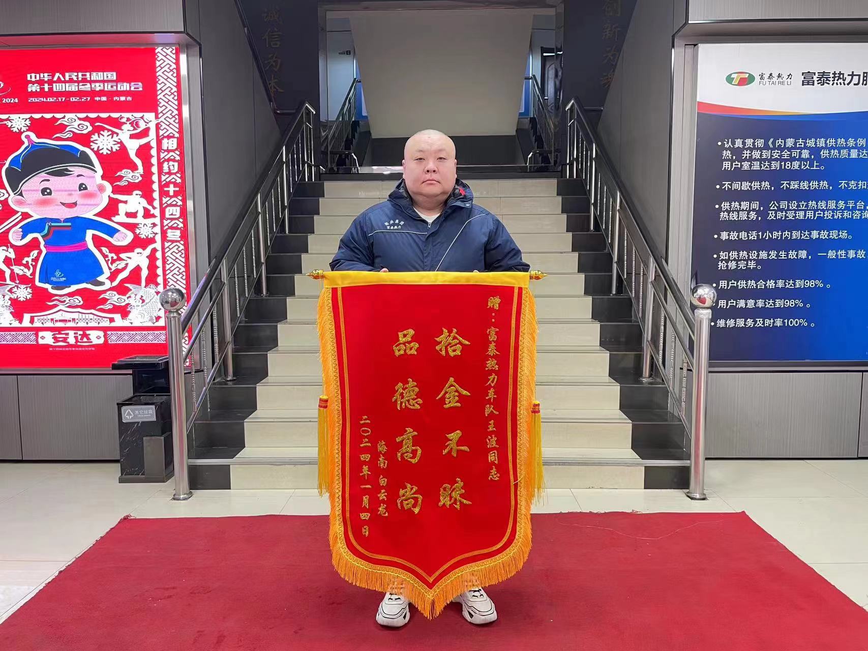 1月9日,海南省來呼辦事的白云龍先生將一面寫有“拾金不昧 品德高尚”的錦旗送到了富泰熱力公司,對公司綜合管理部員工王波拾金不昧的暖心行為表示真摯的感謝。