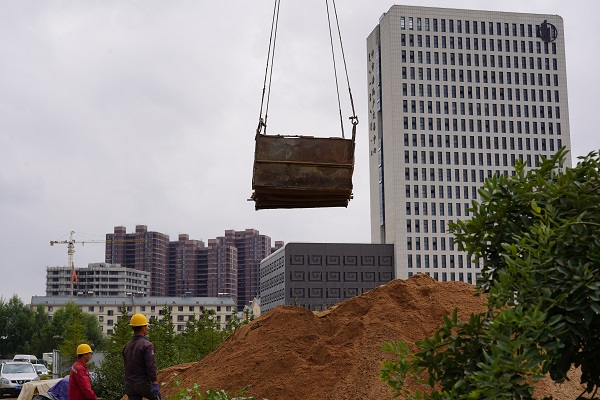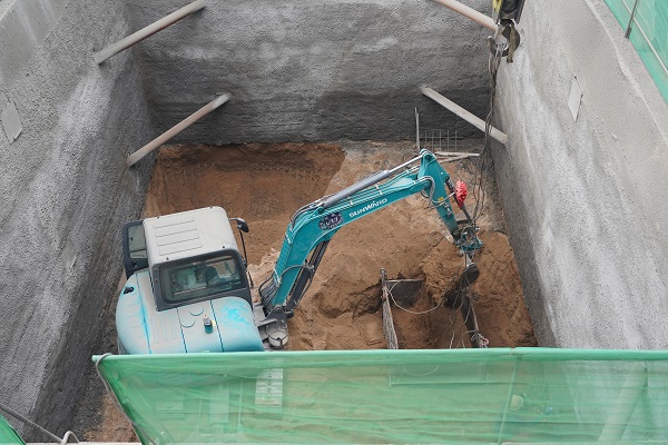 9月24日上午,筆者遠遠看到一吊車正將坑內挖掘的土方吊起,走近作業坑,看到坑內小型挖掘機正在開挖土方,還有2名施工人員正在進行鋼筋網片的焊接。