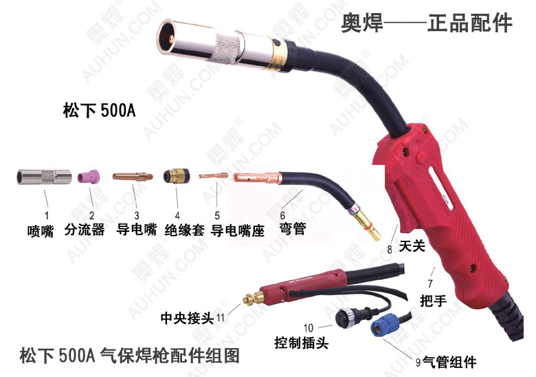 松下500A氣保焊槍(氣冷式)適用于:350-500A氣保焊機使用,暫載率60%時焊機電流500A,使用焊絲直徑:0.8-1.6MM,相關配件:保護套,彎管,導電咀,連桿,絕緣螺母,送絲管。